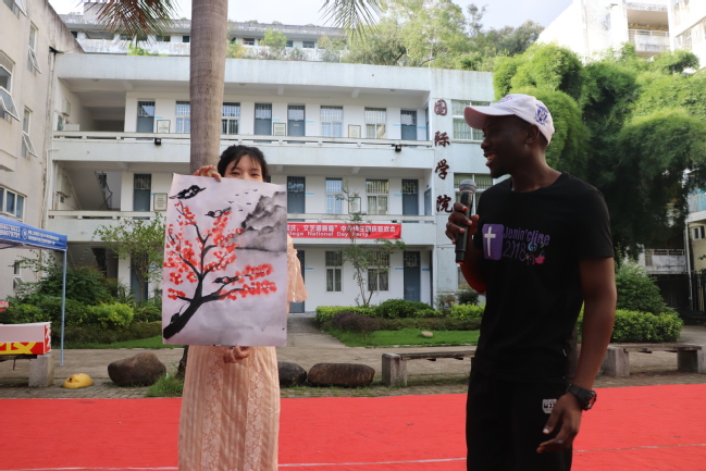 联欢会上,同学们各展风采,呈现了一出出精彩绝伦的节目。开场的古筝、琵琶、二胡、小提琴、长笛等器乐合奏的一曲《花火》扣人心弦;朗诵节目《我和我的祖国》与书法展示相辅相成,传递出对伟大祖国的无限热爱和对当代青年的深切期许;民族舞《重华盛世》、武术表演、汉服展示带人领略了古典舞蹈、传统武术、古典服饰中蕴藏的中华民族优秀传统文化的博大魅力,进一步增强了同学们的文化自信;歌曲串烧、现代舞蹈点燃学院青年学子青春活力,表达出对伟大祖国母亲的崇高敬意。尼日利亚留学生Steve热情献唱民族歌曲,津巴布韦留学生李强现场创作水墨中国画《梅》,以艺术形式送出对中国国庆和学院中外师生的美好祝福。互动环节更进一步拉进了现场师生的距离。联欢会在《再一次出发》《我爱你中国》的歌声中落下帷幕。