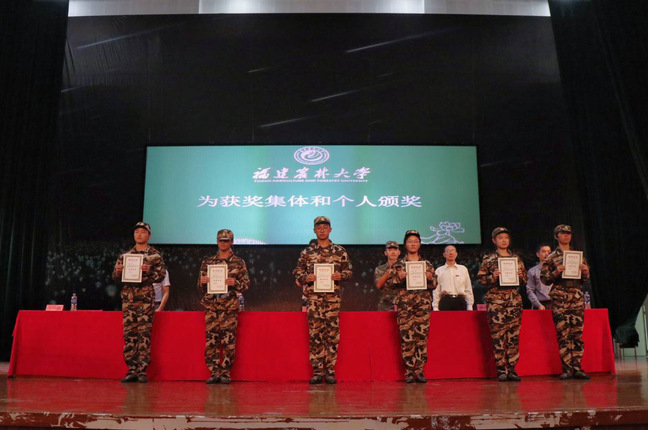 校区学生工作部部长纪文元宣读军训优秀教官、军训优秀辅导员、军训先进集体和先进个人的表彰决定,主席台就座领导为获奖集体和个人颁奖。