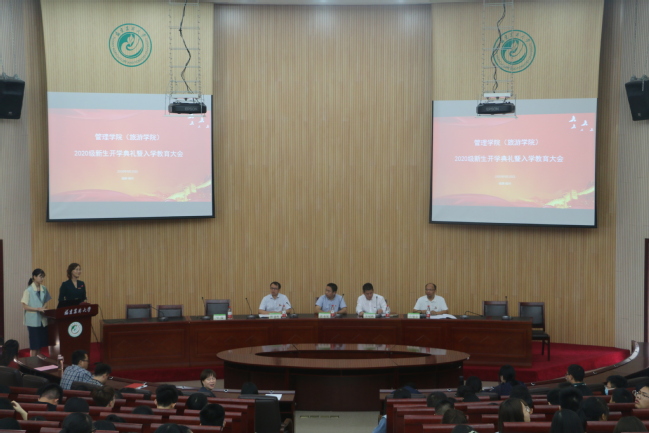 9月25日,管理学院(旅游学院)2020级本科新生开学典礼在博学报告厅举行。院党委书记张开晃、院长苏时鹏、党委副书记陈建辉、副院长石德金、坚瑞出席典礼,各系主任、新生班主任、辅导员和299名2020级本科新生参加典礼。典礼由坚瑞主持。