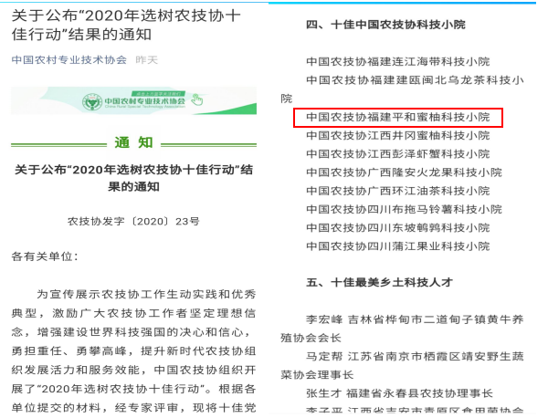 10月15日,中国农村专业技术协会下发《关于公布“2020年选树农技协十佳行动”结果的通知》(农技协发字〔2020〕23号),依托我校资源与环境学院建设的中国农技协福建平和蜜柚科技小院入选2020年“十佳中国农技协科技小院”。