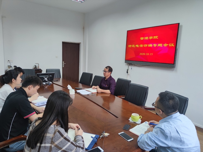 10月15日,管理学院政工召开防范电信诈骗专题会议。院党委副书记陈建辉主持,全体辅导员参加会议。