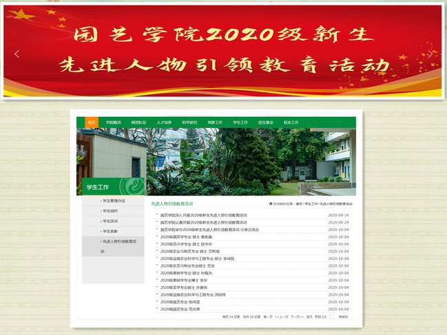 据悉,园艺学院党委高度重视2020级新生的先进人物引领教育,前期组织两次集中学习,学院班子成员深入班级开展主题班会,举办先进人物引领教育院级分享交流会,积极组织新生参与“四史”教育专题网络竞答活动。目前学院正在广泛开展以“爱国心·报国情·强国志”为主题的征文活动。