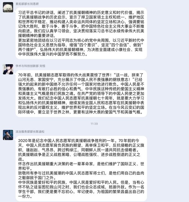 10月23日上午,公共管理学院组织师生学习了习近平总书记在纪念中国人民志愿军抗美援朝出国作战70周年大会的讲话,并在线上进行了分享交流。