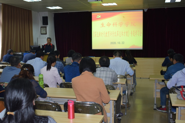 10月22日下午,生命科学学院组织召开全院教职工会议,学习《深化新时代教育评价改革总体方案》(以下简称《总体方案》)与《中华人民共和国公职人员政务处分法》(以下简称《政务处分法》)。会议由学院党委书记陈建辉主持。
