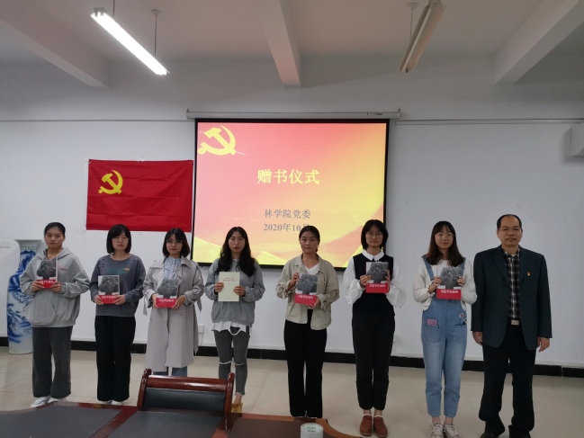 蓝天水代表学院向新党员代表赠送了《习近平在福州》《习近平总书记教育重要论述讲义》等书籍,并对新党员提出两点要求:一是要牢记入党誓词,经常用党章这面镜子时刻对照检查自己,约束、指导自己,走好自己新的长征路;二是要坚持知行合一,争做“四个合格”党员,发挥党员的先锋模范作用,为实现党的“两个一百年”目标不懈奋斗。