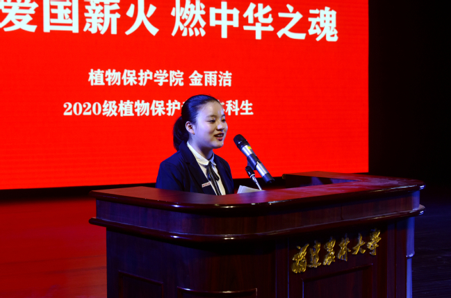 我是来自植物保护学院植物保护专业的金雨洁。我分享的题目是《传爱国薪火,燃中华之魂》。