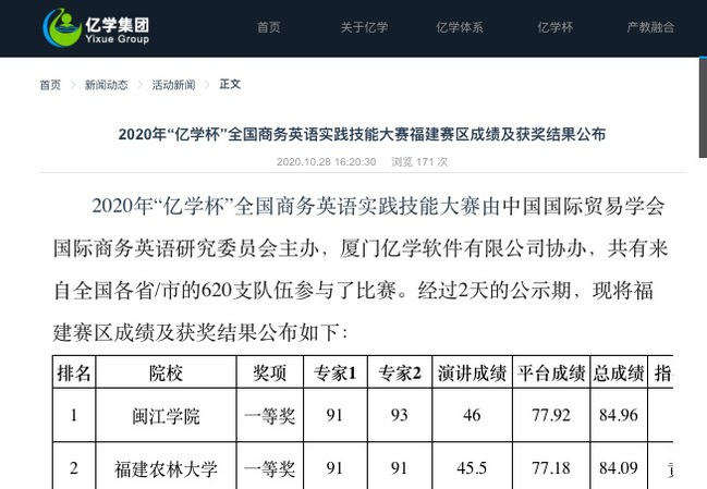 “亿学杯”全国商务英语实践技能大赛是一项全国性赛事,大赛旨在促进全国高等院校商务英语及其相关专业的建设和教学改革推动产教融合和校企合作,搭建校际师生交流平台,进一步提升商务英语及其相关专业大学生的职业能力,全面提高英语专业的人才培养质量水平。本届比赛中共有来自全国各省、市的620支队伍参与了比赛,其中福建省赛区有我校、闽江学院等10所院校报名参赛。