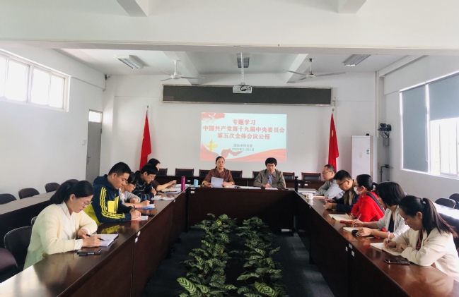 11月4日上午,国际学院党委在明北附303会议室召开理论学习中心组扩大会,专题学习中国共产党第十九届中央委员会第五次全体会议公报。理论中心组成员、教工党支部书记、系部主任、科级干部等参会,会议由院党委书记张华英主持。
