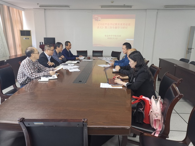 11月12日上午,食品科学学院党委理论学习中心组开展学习贯彻习近平总书记教育重要论述第三场专题学习研讨。学院党委副书记余顺兴,党委委员刘斌作重点发言,学院党委书记苏健涵主持会议,学院领导班子成员、党委委员参加会议。