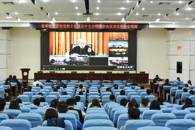 11月12日下午,我校组织各学院、各部门科级干部和学生党支部书记180多人在禧强楼学术报告厅集中收看宣讲报告会。