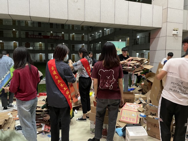 活动现场,志愿者们一一上门回收同学们闲置的纸盒和旧衣物,动手将快递箱分类、整理、称重并折算为相应的积分,大家合理分工,有条不紊地完成既定安排的工作任务。参与活动的同学也自觉帮忙,现场气氛热烈。同学们纷纷表示,废弃快递箱浪费资源,污染环境,尽自己的微薄之力,推广垃圾分类,倡导绿色节约,非常有意义。