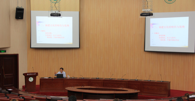 讲座中,马照南教授从文化的涵义及划分标准、中华优秀传统文化、福建文化的特色与优势等方面介绍了何为文化,以及习近平总书记关于宣传思想文化工作的重要思想,并从海洋文化、朱子理学、近现代文化三大方面向师生们讲述了福建文化,最后通过学习研究习总书记在福建工作期间提出的新思想、新观点,探讨了如何持续提升福建文化影响力,进一步繁荣发展福建文化。