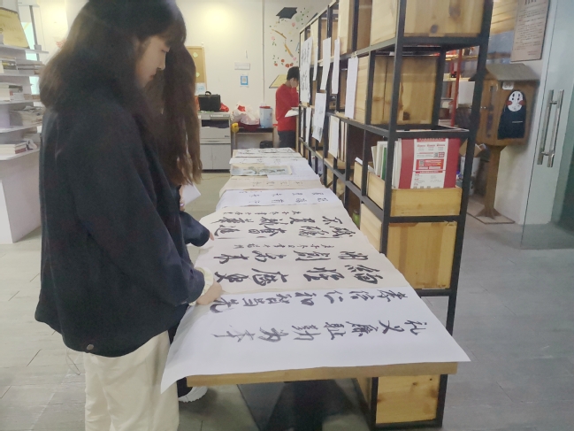 11月21日,经济学院在东苑鸟巢书吧举行“不忘初心,奋进新时代”中华诵书画作品展。
