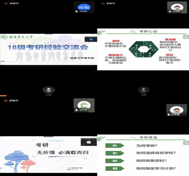 11月23日晚,资源与环境学院线上举办考研交流会。学院特别邀请了四位已考取了“双一流”高校研究生的学长学姐分享考研心得。学院2018级学生线上参加交流会。交流会由辅导员张龙主持。