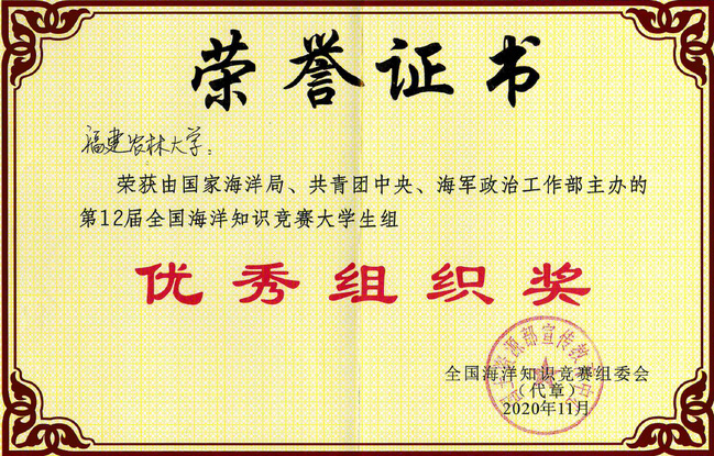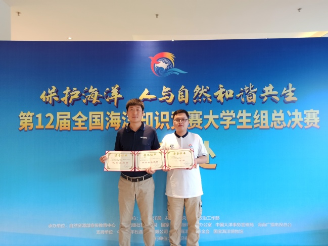 11月22日-23日,由国家海洋局、共青团中央、海军政治工作部主办,自然资源部宣传教育中心、海洋出版社、国家海洋局基地考察办公室、中国大洋事务管理局、海南广播电视总台承办的第12届全国大学生海洋知识竞赛在海南海口举行。来自全国包括厦门大学、山东大学、中国海洋大学、华中科技大学等40余所高校的60名选手参赛。我校动物科学学院(蜂学学院)2017级水产养殖学专业林东萍同学凭借扎实的海洋知识储备、良好的心理素质和快速的临场反应,最终斩获全国二等奖,水产养殖系教师胡丰晓获评优秀指导教师,我校获优秀组织奖。
