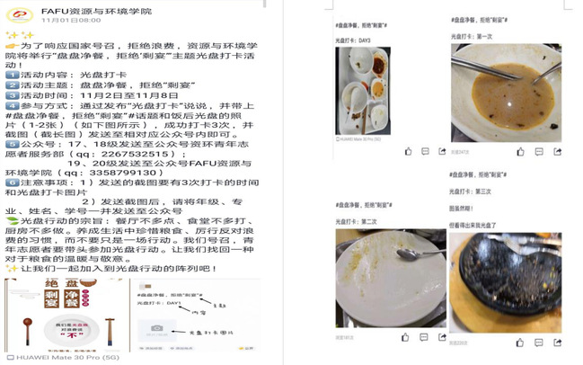 近日,资源与环境学院积极践行习近平总书记对制止餐饮浪费行为的重要指示精神,通过线上线下相结合方式组织学生开展“厉行节约,拒绝浪费”系列活动。