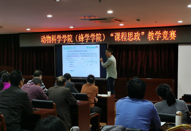 12月3日,动物科学学院(蜂学学院)在学院会议室举办“课程思政”教学竞赛。学院党委副书记徐通明、副院长苏松坤、陈大福出席比赛现场。福建省优秀教师、校教学名师、生命科学学院陈煜,校教学名师、林学院陈灿,动物科学学院(蜂学学院)王长康、梅景良、马燕梅老师受邀担任评委。全院专任教师到场观摩。