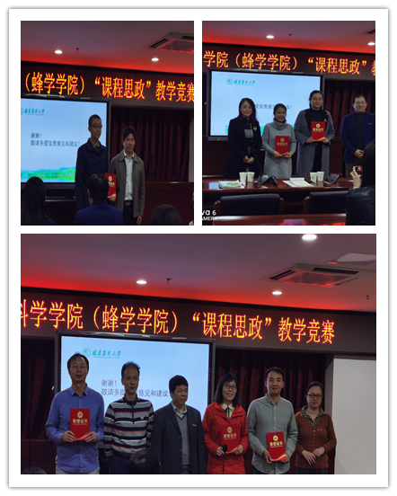 6名参赛教师按赛前抽签顺序,依次上台、现场授课,结合自身学科特色,运用启发式、互动式等教学模式,通过与经典案例、时事热点等相结合,深入挖掘提炼专业课程中蕴含的思政元素和德育内涵,把思想政治教育有机融入到专业课程的课堂教学中,展示了昂扬向上的精神风貌、生动丰富的教学内容、各具特色的教学设计和沉稳自信的教学风采。经角逐,动物医学系教师李健捧得桂冠,动物科学系教师张婧、水产养殖学系教师严美娇获得二等奖,动物医学系教师殷光文、中药资源与蜂产品系教师徐晓兰、蜂学系教师段辛乐获得三等奖。