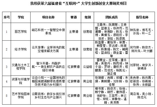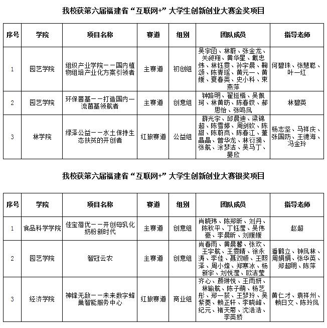 近日,福建省教育厅公布了第六届福建省“互联网+”大学生创新创业大赛获奖名单。我校获金奖3项、银奖3项、铜奖5项、“十佳人气奖”2项、“逐梦小康奖”1项,何碧珠、林碧英、杨志坚、黄仁才4位老师获“优秀创新创业导师”称号,我校获高校集体奖、“青年红色筑梦之旅”集体奖,连续6届获大赛优秀组织奖。