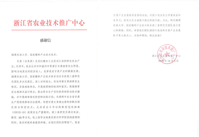 近日,浙江省农业技术推广中心发来感谢信,感谢国家甘蔗工程技术研究中心、国家糖料产业技术体系岗位专家高三基研究员团队以强农兴农为已任,近两年来多次奔赴到浙江主要甘蔗(含果蔗)蔗区,深入田间地头,实地考察甘蔗病虫害发生情况,通过讲座培训和现场指导等方式,传授基层农业技术人员和种植大户有关甘蔗病虫害诊断及防控技术,并开展相关技术的集成与试验示范。尤其是在今年初的新型冠状病毒(COVID-19)疫情发生严重期间,通过电话、微信、QQ等方式,线上指导当地蔗农抓好科学防控抗击疫情的同时,抢农时做好春植蔗种植。高三基研究员作为一名党员不忘初心、牢记使命,积极投身新时代乡村振兴主战场,彰显了新时代农业科技人员勇于担当、甘于奉献的良好精神风貌。感谢信充分肯定高三基研究员团队发挥高校人才和专业优势,在他们团队的帮助下,浙江省甘蔗产业发展取得显著的成效,对提升浙江省农业质量效益和竞争力,促进乡村全面振兴做出积极贡献。