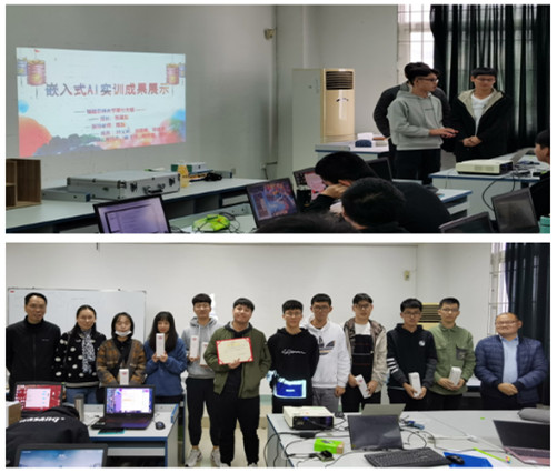 本次实训以新工科理念为先导,结合我校农林特色及专业前沿知识,共设计 “AI人工智能、机器视觉、嵌入式物联网”三大主流方向实训模块,包含理论知识强化、项目训练教学、企业项目实战等内容;以“项目实战”为导向,采取“理论教学 +项目实战”相结合的方式教学。根据疫情常态化防控要求,通过“请进来”和“校企协同育人”模式,邀请福州市传一教育管理有限公司进校完成实训工作,企业派了技术总监陈灏担任授课教师,派了1名职业方向规划师分析、1名就业辅导老师负责实训期间学生管理工作。同时,电子信息工程系派了3名老师参与学生日常管理和服务工作。实训成果采用分组答辩展示,并对优秀团体及个人给予表彰。最后,企业技术团队还针对应届毕业生生如何撰写简历、面试技巧等环节进行了指导。