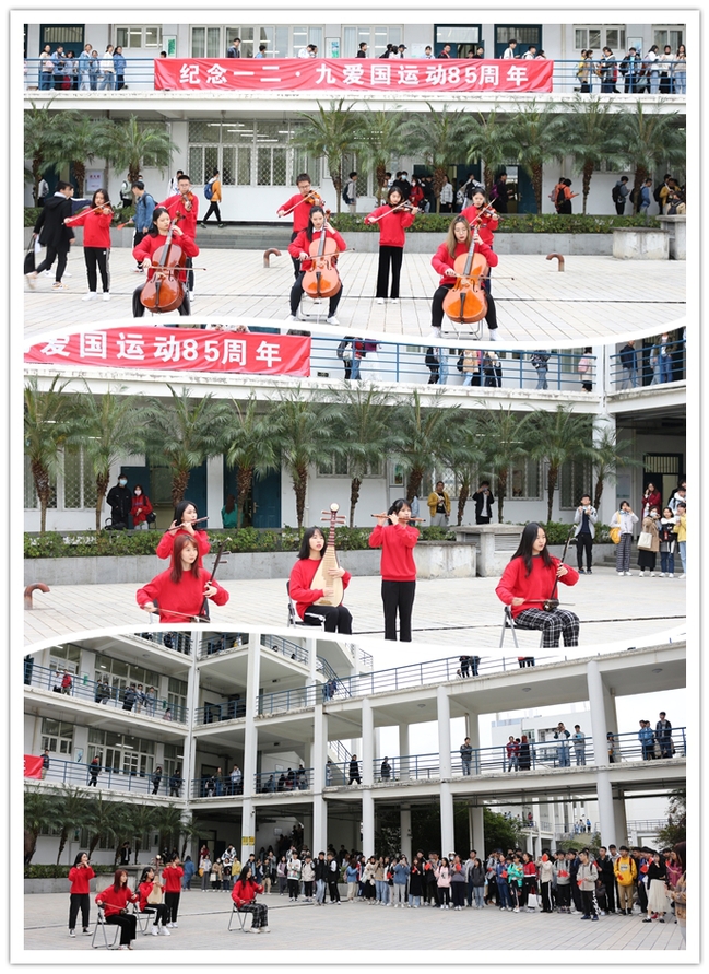 12月9日上午,我校在创新楼前开展了纪念“一二·九”运动八十五周年快闪活动,校大学生艺术团带来的西洋乐合奏《我和我的祖国》和民乐合奏《保卫黄河》将课间的气氛瞬间点燃,团员们用歌曲缅怀历史,抒发对党和祖国的热爱之情,引得同学们纷纷驻足观赏。