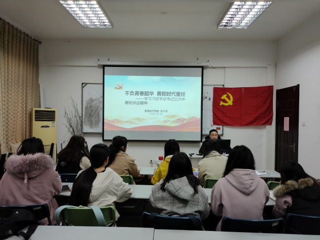 12月17日上午,管理学院党委书记张开晃给研究生第三党支部上题为《不负青春韶华,勇担时代责任》的专题党课,学习、交流习近平总书记三次中青班讲话精神。