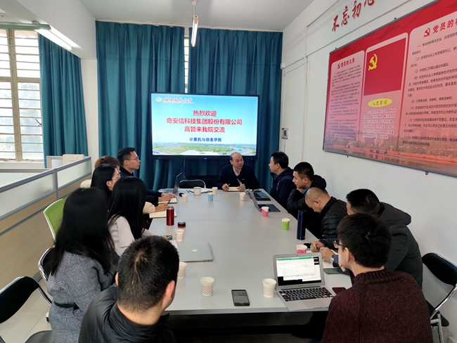 12月18日,计算机与信息学院网络空间安全系邀请奇安信科技集团股份有限公司(以下简称“奇安信公司”)集团教育部张锋经理一行来校进行产学研合作交流,交流会在学院办公楼308室举行;学院党委副书记(主持)张金山、教学办张俊辉老师、辅导员林大启和网络空间安全系部分教师参加了交流会。