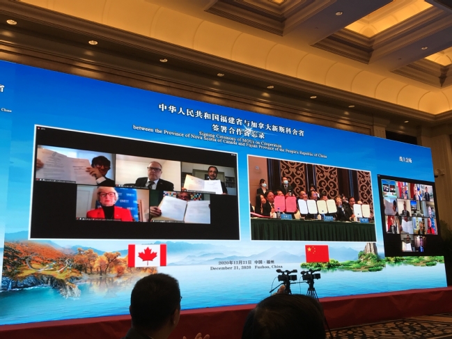 12月21日晚,福建省与加拿大新斯科舍省结好协议书线上签字仪式在福州隆重举行,两省领导及外事、教育、商务、农业、渔业、文化旅游等部门负责人参加活动。