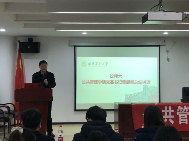12月25日,公共管理学院于公管楼201室举办“学院周”文艺活动表彰会,表彰在“明立德初心,育时代新人”“学院周”活动中表现突出的文艺先进个人、团体。学院党委书记曾起郁、副院长阮晓菁、党委副书记郑龙章以及学院200名学生参加此次表彰会,会议由辅导员叶威先主持。