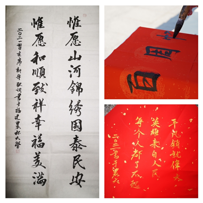 活动在校大学生艺术团舞蹈队的表演《黎乡笠影》中拉开序幕,绚烂的舞姿,展现了浓郁的民族风情。南峰文学社和校大学生艺术团主持队分别带来了朗诵《祖国啊祖国》和《红船梦飞扬》,用诗歌铭记辉煌历史,歌颂伟大时代。书法美术协会、茶文化协会和尔雅汉服协会的传统表演《书写青春华章》《初心》《锦绣中华,上国衣冠》带领同学们领略中华优秀传统文化的风采。丝竹管弦,畅叙抒情,民乐合奏《天山之歌》《保卫黄河》和管乐合奏《欢欣舞曲》用饱含深情的乐音,奏响青春告白祖国之歌。三农爱心社精心编排的情景剧《书记下乡》展现了扶贫干部为民服务的初心。合唱团带来的《您花开的样子》唱出了对国家繁荣富强,民族团结和谐的美好祝愿,将现场的气氛推向了高潮。拓荒广场上,各个社团的活动精彩纷呈,热闹非凡,传递时代精神,展现青年朝气。大学生书法美术协会摆出了书法长卷,书写“习语金句”,并邀请师生书写对新年的展望,对祖国和党的祝福,吸引了来往的师生纷纷驻足。“繁荣昌盛”“山河锦绣,国泰民安”“前程似锦”……同学们用毛笔写下了最真诚的祝福。茶文化协会邀请同学们参加“品茗猜茶”的活动,在寒冷的冬日里给同学们送上一杯暖心的茶,普及茶文化知识,弘扬中华传统文化;环境保护协会贯彻绿水青山就是金山银山的生态环保理念,开展“垃圾分类粘土画”活动,引导师生树立正确的分类方法,养成良好的分类习惯;明德廉风协会的“党史知识问答”活动,引领同学们感受“红船精神”,筑牢信仰之基;3C动漫协会的“记忆大师”通过游戏,带领大家回忆新中国发展的点点滴滴;社团管理部的“绘新绘意”“水墨新春”“新与心愿”以及书法美术协会新年送“福”送春联的活动,让现场“年味”十足。青春献礼100年,虽然活动形式各有不同,但是同学们心中的那份爱国心、强国志、报国情却是紧紧联系在一起,共同在新年的第一天为党和祖国送上最真挚的祝愿。
