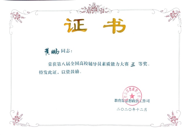 12月29日-31日,第八届全国高校辅导员素质能力大赛决赛在浙江大学举行,来自全国各高校的81名辅导员参加了比赛。我校材料工程学院辅导员黄鹏作为福建省推荐选派的3名参赛选手之一获得大赛三等奖,代表学校在全国大赛舞台上展示风采。
