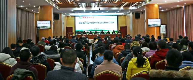 1月12日下午,经济管理学院在常盛会议中心召开首次全院教职工大会,会议由副院长石德金主持,校党委常委、副校长、院长林庆藩,院党委书记张开晃、副书记陈建辉、李健英、副院长坚瑞、管曦、李坤明及经济管理学院教职工近160人参会。