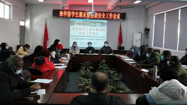 1月14日,国际学院在学院会议室分两场召开来华留学生期末暨假期安全工作会议。学院党委副书记王小榕、留学生管理办公室主任陈昕、留学生辅导员、所有在校来华留学生参加了会议。