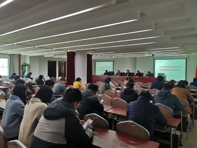 1月21日下午,公共管理学院在东苑201报告厅召开期末重点工作暨寒假疫情防控工作会议,学院全体教职工参加了会议。会议由副院长周毕芬主持。