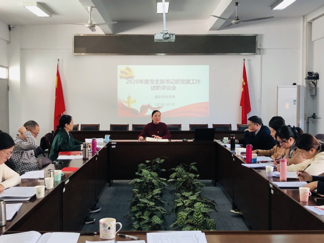 1月21日下午,国际学院党委在明北附楼303会议室召开2020年度下属党支部书记抓党建工作述职评议会。校党建组织员张根成出席指导,学院党委委员、党支部书记、党支部委员、党员师生代表参加会议,院党委副书记王小榕主持会议。