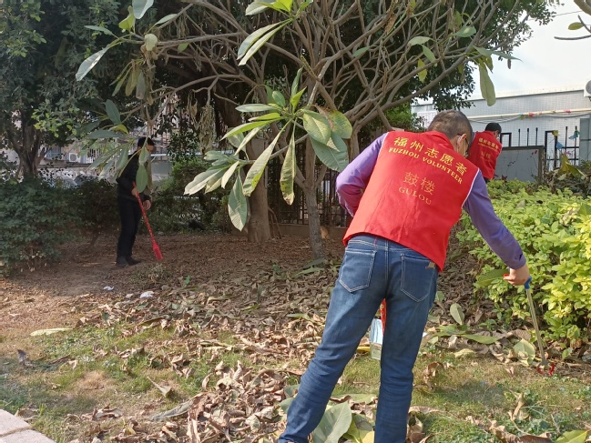 完成防疫抗疫宣传工作后,志愿者们协助兴园社区的党支部开展“家在鼓楼,靓丽过年”清洁月活动,清扫社区街道垃圾、草坪落叶,协助兴园社区,服务社区群众,让群众安心过个好年。