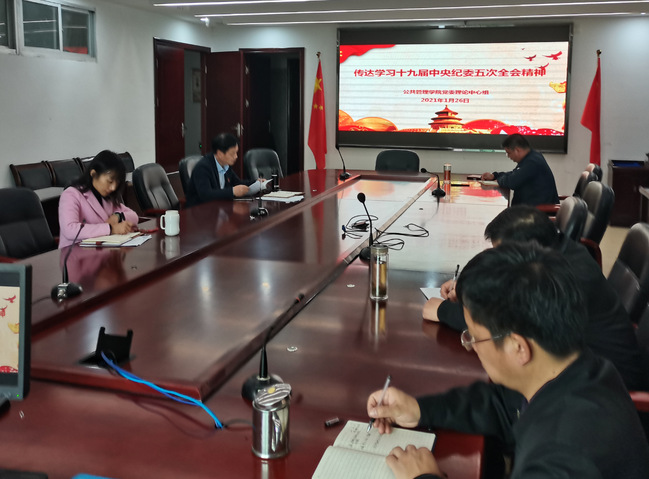 1月26日下午,公共管理学院党委理论学习中心组召开学习会议,专题学习习近平总书记在十九届中央纪委五次全会上的重要讲话精神。学院党委理论学习中心组成员参加学习,学院党委书记曾起郁主持会议。