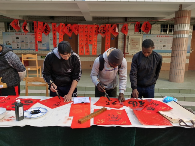 两位老师向留学生介绍了中国春节写春联的传统以及蕴含的美好寓意,展示了春联书写以及“福”字的不同书写形式,通过现场书写展现了中国书法文化的博大精深,博得了在场留学生的阵阵喝彩。在两位老师的指导下,留学生们学写了“福”“春”以及“子去丑来腾锦绣,鼠归牛到竞辉煌”“新春乐咏黄牛颂,小院频传喜鹊歌”等对联,表达了对新年的期盼与希冀,现场一片祥和的“中国红”。
