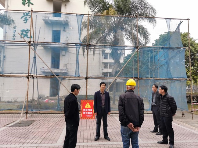 2月5日上午,校党委常委、副校长林庆藩到危房石仓楼检查指导拆除工作。