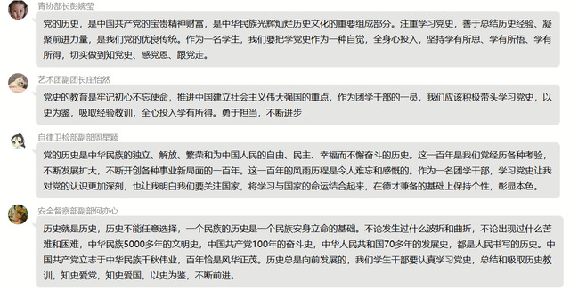 2019级土地资源管理专业的林玮昕同学表示:“历史是最好的教科书,学院积极开展党史学习,我们要在学习党史过程中,坚定信念,提高自身素质,加强我们爱国爱党的信念,积极向党组织靠拢!”