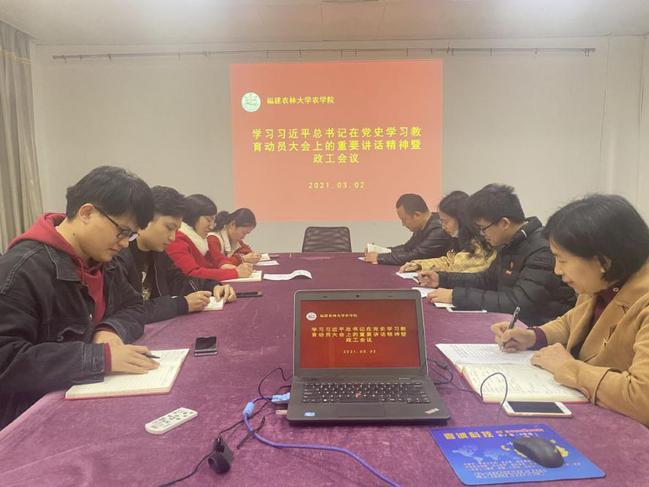 3月2日下午,农学院在学院三楼会议室召开关于学习习近平总书记在党史学习教育动员大会上的重要讲话精神和习近平总书记在全国脱贫攻坚大会上的重要讲话精神专题学习研讨会暨政工会议,学院全体辅导员参加会议,本次会议由院党委副书记林素文主持。