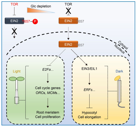 我校熊延团队长期从事TOR领域研究。与传统蛋白质翻译调控机制不同的是,其团队前期研究发现植物TOR激酶可以感受糖营养能量信号,直接促进细胞分裂周期关键转录因子E2Fa/b的活性,激活S-期基因表达来调控植物根尖和茎尖细胞的分裂和生长。但植物糖-TOR信号通路如何调控整个基因转录组重编程的分子机制却仍然是个迷。