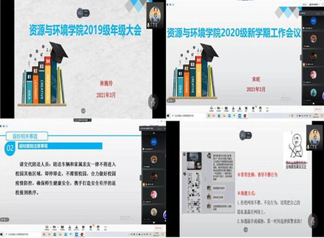 各年级辅导员根据工作要求,结合工作实际,在线开展年级会议和“开学第一课”:一是向同学们传达学校疫情防控要求。各年级辅导员向同学们传达了学校疫情防控相关要求,希望同学们充分认识当前疫情防控的重要性,自觉遵守学校疫情防控的相关规定,按照学校要求,积极配合,为自己的新学期打下坚实基础。二是传达学校和学院2021年春季学期返校的相关工作安排。各年级辅导员详细向同学们讲述返校时间安排,提醒同学们做好返校准备、做好返校途中个人防护等注意事项,确保平安、顺利返校。三是引导同学们积极投入新学期的学习生活中。各年级辅导员希望同学们认真梳理总结学习经验,认真做好新学期规划,积极调整好心态,投入到新学期的学习生活中去。四是引导同学们增强安全防范意识。各年级辅导员通过PPT方式,从校园安全、出行安全、网络安全、人身财务安全、用电消防安全和食品安全等多个方面进行了安全知识宣讲,引导同学们时刻紧绷安全的弦,将安全意识融入日常生活,共同筑牢校园安全防线,营造安全稳定的校园环境。