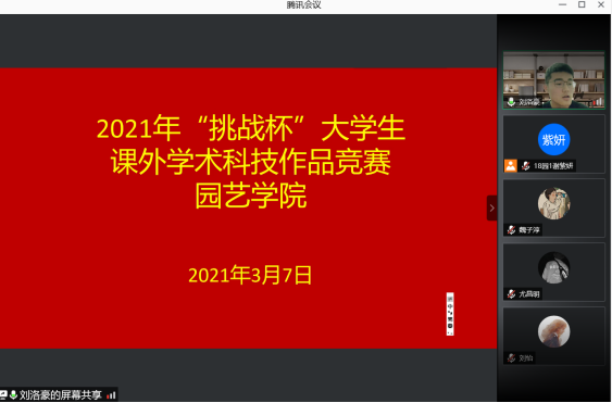 3月7日下午,园艺学院通过腾讯会议平台举办了2021年“挑战杯”大学生课外学术科技作品竞赛,比赛邀请了生命科学学院张灵玲教授,植物保护学院潘晓鸿副教授,林学院吴松青副教授担任评委,学院院长陈清西、党委副书记周娟娟和副院长曾黎辉等参赛师生共70多人线上观看决赛。
