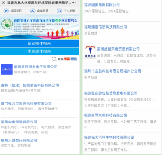 近期,为全力做好疫情防控期间毕业生就业服务工作,为毕业生和用人单位搭建双向交流的平台,资源与环境学院联合鼓楼区人力资源和社会保障局举办2021年毕业生专场线上招聘会。本次招聘会共有中农立华(福建)农业科技有限公司、福建绿疆生态环境咨询有限公司、福建臻善信息科技有限公司等近百家企业。