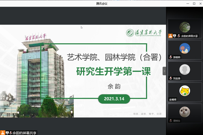3月11日、14日,艺术学院园林学院通过线上会议形式分批组织全体研究生开展“开学第一课”,会议分别由辅导员胡育璐、余韵主持,全体研究生参与本次会议。