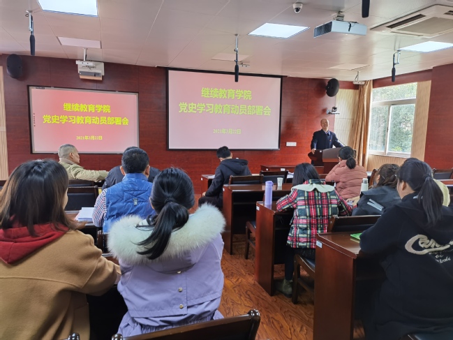 3月22日上午,继续教育学院党委在五楼多媒体教室召开党史学习教育动员部署会,全体党员参加,院党委书记范焕谦作动员讲话。