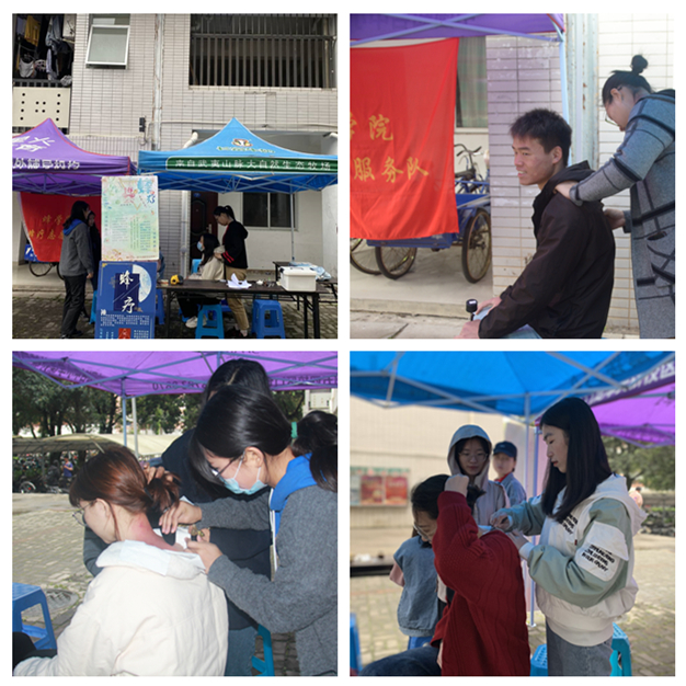 蜂疗义诊志愿服务主要由蜂学专业与药资专业同学组成,他们运用专业所学进行服务,主要针对同学们肩颈部肌肉僵硬、身体疲劳等的症状,为同学们进行对应的按摩、刮痧与拔罐,在服务的同时叮嘱刮痧后注意事项与健康生活的小常识。
