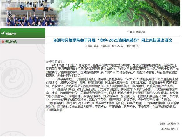 4月1日,为深入贯彻落实习近平总书记关于烈士祭扫工作的重要指示精神和党中央、国务院和省市开展“守护·2021清明祭英烈”祭祀活动部署,结合当前疫情防控情况,资源与环境学院向全体同学发起网上祭扫英烈活动倡议。